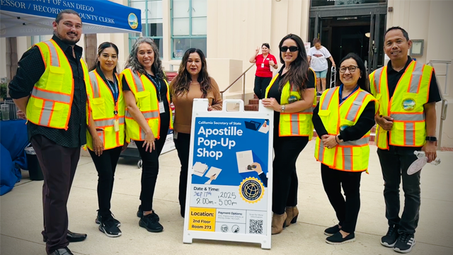 The California Secretary of State’s Apostille Pop-Up Shop will be at the Assessor/Recorder/County Clerk's Office at the San Diego County Administration Center. Anyone looking to have their records authenticated for international travel will have an opportunity to do so at this one-day event.